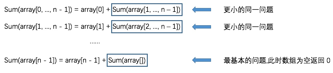对于以上例子,可以这样理解:在使用递归时,可以注意递归函数的“宏观”语意。在上面的例子中,“宏观”语意就是计算 array[l...n) 区间内所有数字的和。这样子理解递归函数再去观看函数中的将原问题转换成小问题时,会更好地理解这个函数要做的事情,简单来说递归函数就是一个完成一个功能的函数,只不过是自己调用自己,每一次转换成小问题时完成的功能都是数组的某个数加上剩余数的和,直到无数可加为止。这个数组求和的递归过程如下图所示: