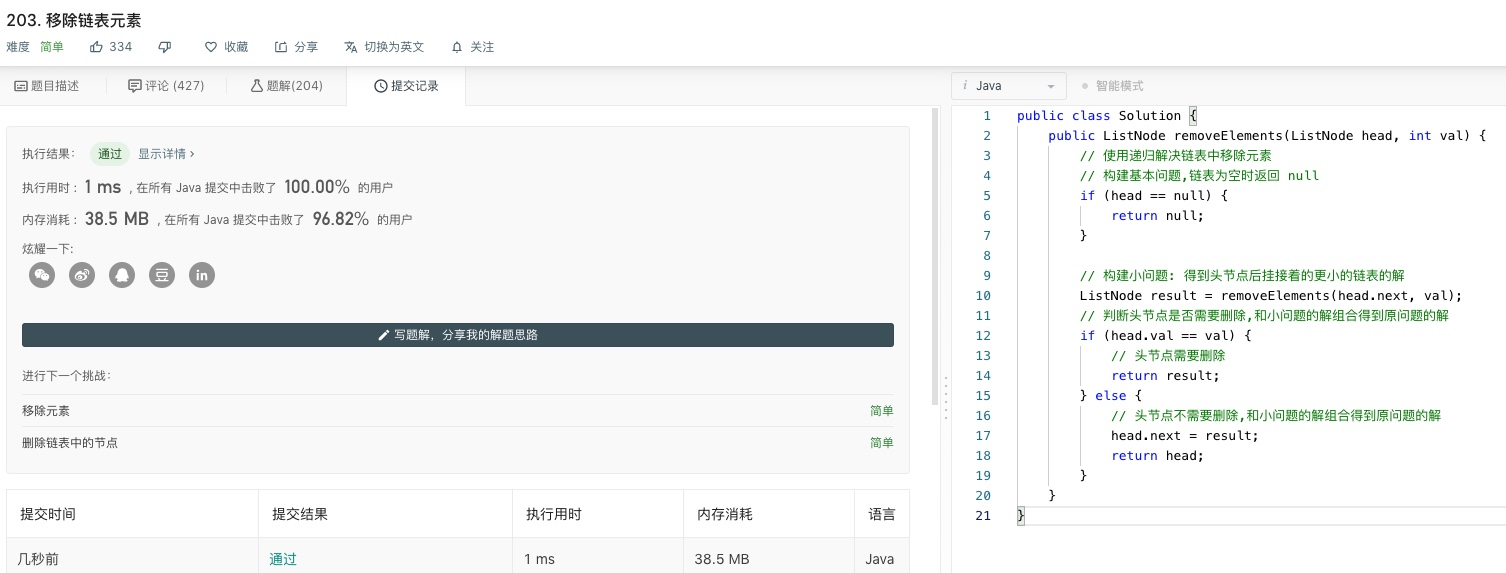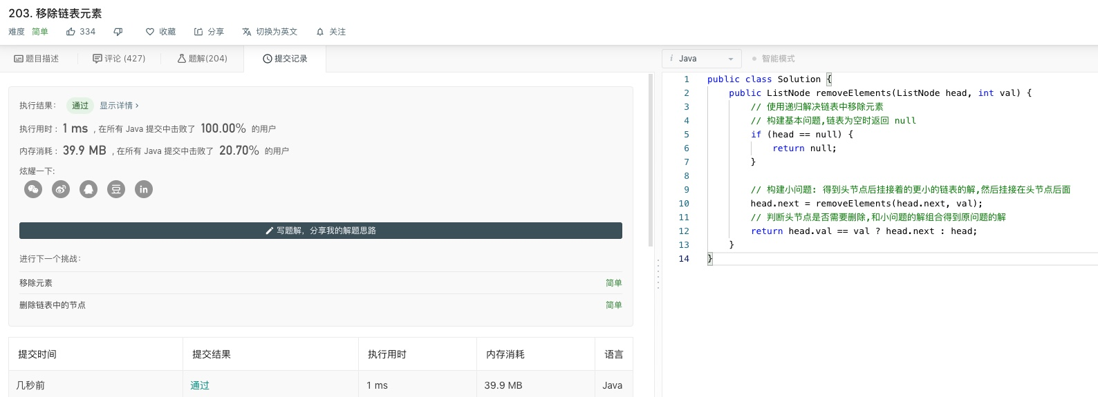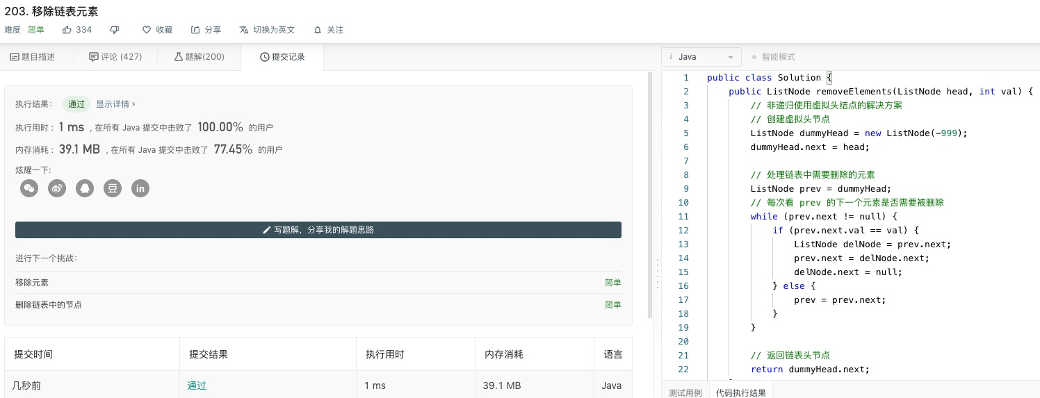 此时,两种方案都正确的运行了。对于链表的删除逻辑在使用虚拟头节点和不使用虚拟头节点的情况都实现了一遍,这也是在之前的链表的数据结构的实现中涉及到的部分,这里再次回顾一遍加深印象,也方便后面使用递归方式实现该题目后对比两种不同方式的异同。
