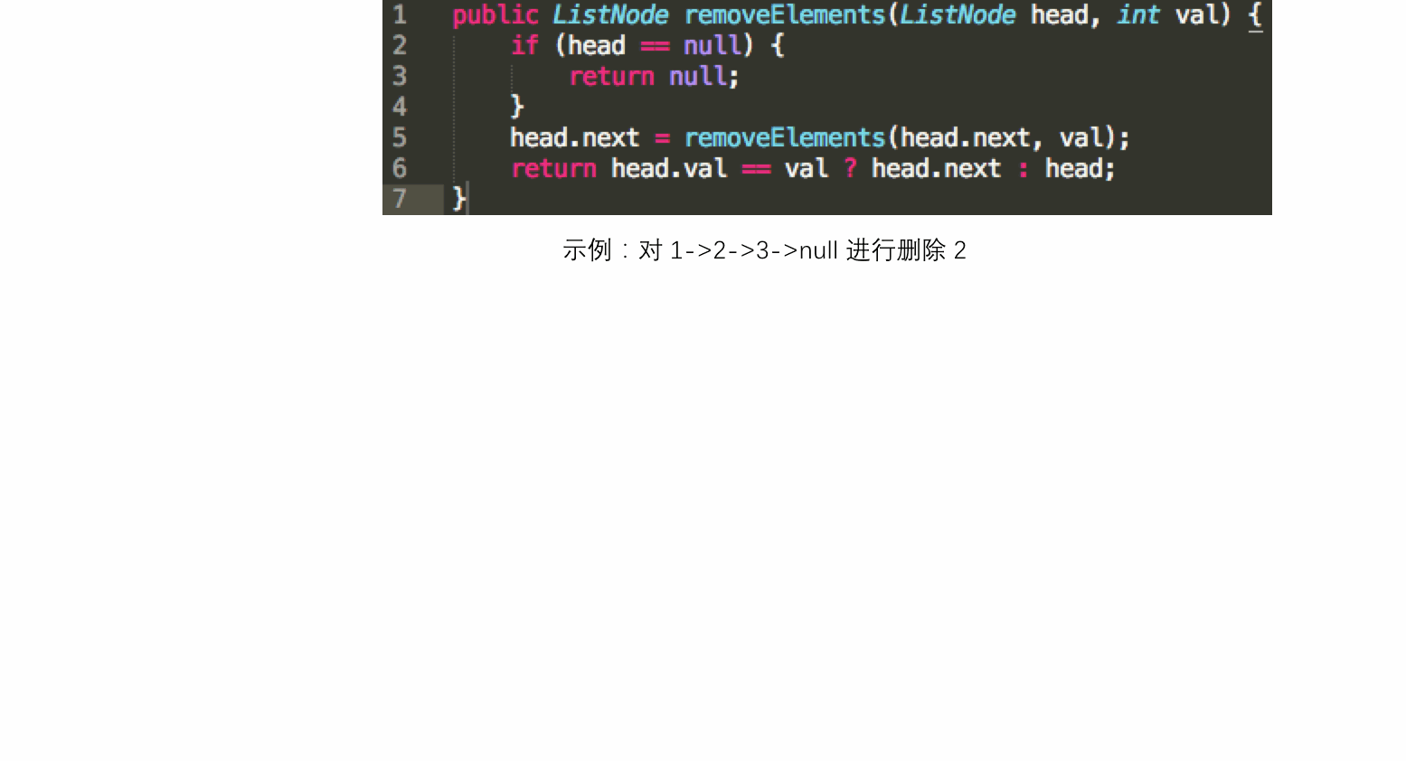 所以此时再看回之前的 203 号题目:移除链表中的元素。就可以将题目提供的链表看成上图所示的结构,然后使用递归解决更小的链表中要删除的元素得到这个小问题的解,之后再看头节点是否需要删除,如果要删除就返回小问题的解,此时也就是原问题的解了;不删除的话就将头节点和小问题的解组合起来返回回去得到原问题的解。这个过程用图来表示为以下图示: