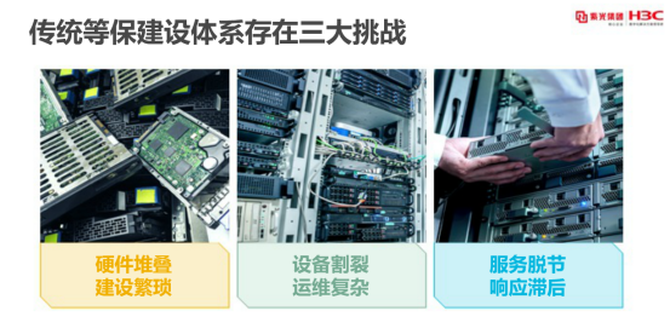 根据陈靖介绍,最新推出的新华三安管一体机2.0产品主要是面向等保三级要求。他认为传统的等保建设体系主要存在以下三大挑战: